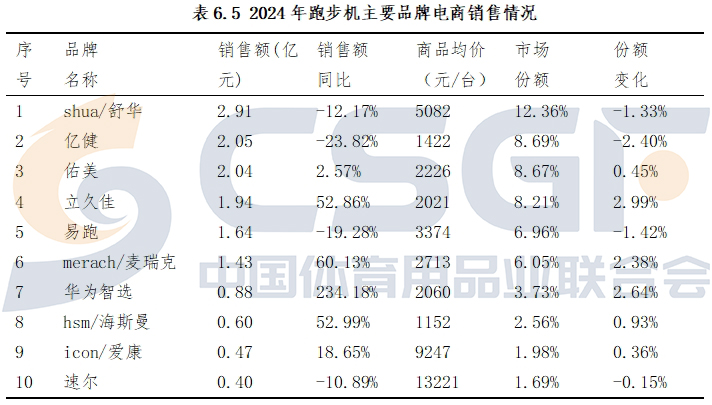 2024年,舒华居于国内跑步机电商销售领先地位,销售额2.91亿元,占据12.36%的市场份额。亿健、佑美、立久佳、易跑等品牌也一直保持了较高市场占有率。爱康、速尔、泰诺健等国际品牌在高端跑步机市场具有很强竞争力,市场份额保持稳定。