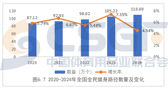 近年来,我国体育场地建设持续推进,保持了较高的增长速度。按照国家体育总局公布的全国体育场地统计调查数据,2024年全国全民健身路径达到110.00万个,同比增长4.54%。