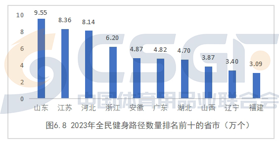 全民健身路径在各省市分布很不均衡,区域间差异较大。按照各省市发布的2023年体育场地统计调查数据,截至2023年底,全民健身路径存量最高的是山东省,共有9.55万个,其次为江苏、河北、浙江,分别有8.36万个、8.14万个、6.20万个,数量排在前十的省份如图所示。
