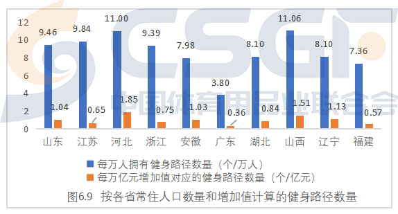 按照当年常住人口数量计算,在排名前十的省份中,山西省每万人拥有的健身路径11.06个,数量最高;其次为河北11.00个,江苏9.84个。按照各省2023年地区增加值计算,每亿元增加值对应的健身路径数量为河北1.85个、山西1.51个、辽宁1.13个。