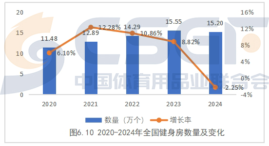 在健身房方面,2024年全国健身房数量达到15.20万个,较上年减少2.25%。从2020年至2024年,全国健身房数量实现32.40%增长,年均增长7.27%。