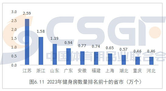 按照各省市的统计数据,2023年,江苏省拥有的健身房数量最多,达到2.59万个。其次为浙江1.58万个,山东1.19万个。广东、安徽、福建、上海、湖北等省市健身房数量也都超过5000家,这些省市也是商用健身器材需求的重点地区。