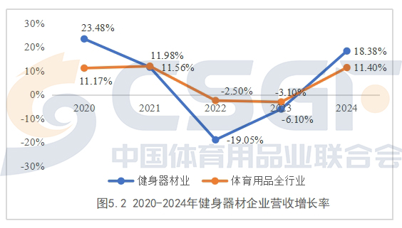 经联合会的走访及调研,2024年健身器材行业稳健运行,表现出良好的发展韧性和内在动力。经历了2022年和2023年的整体下滑之后,2024年出现力度较强的回升,营收增长率达到18.38%,显示出健身器材行业回暖势头良好。
