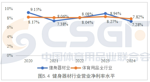 整体上看,行业净利率也呈现微幅下滑趋势,从2020年的9.15%下降到2024年的7.28%,五个年份中有三个年份低于体育用品全行业平均水平。