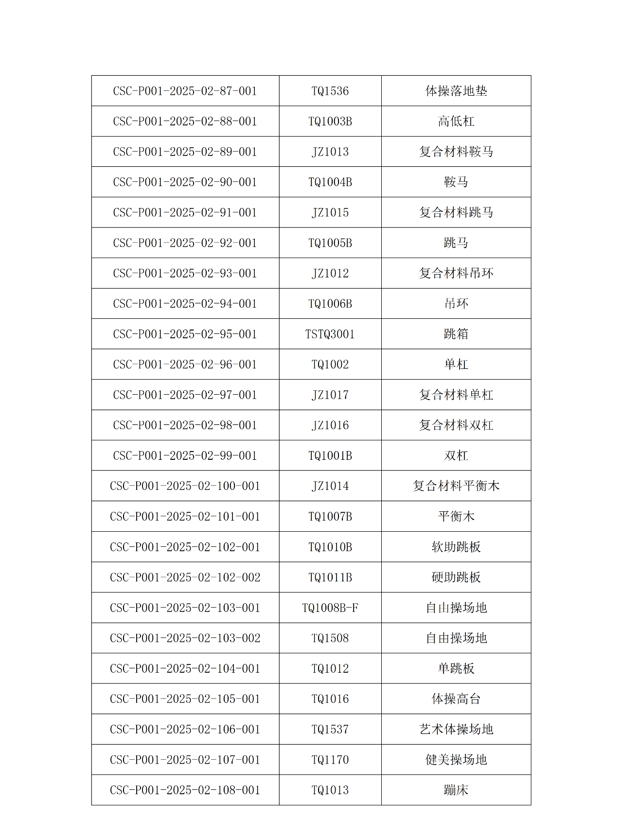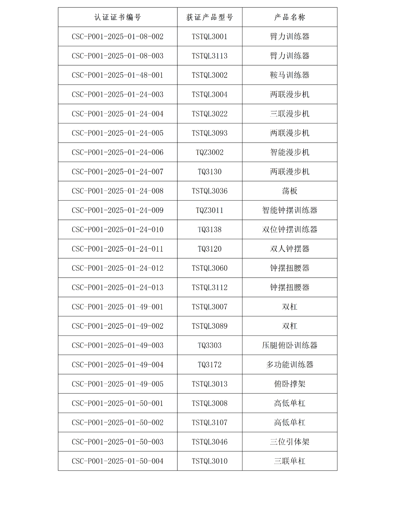 山东泰山体育器材有限公司获得由中体联(北京)认证服务有限公司颁发的室外健身器材、体操器材产品认证证书,证书明细如下:(共191张)。特此公告。