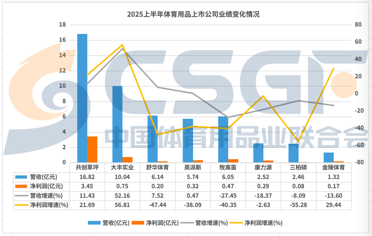 在联合会选取的8家体育用品上市公司中,除共创草坪净利润保持稳健增长、大丰实业和金陵体育净利润回暖之外,其他体育用品上市公司上半年归母净利润均出现了不同程度的下滑。