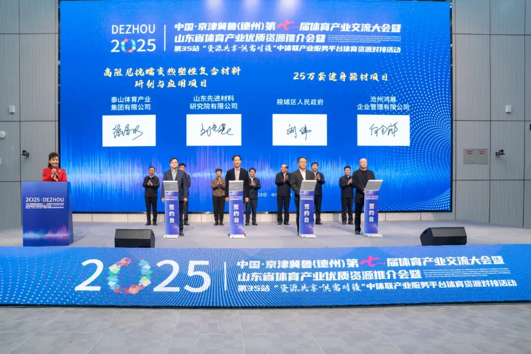 会上,举行了集中签约仪式。山东省体育局、山东省工业和信息化厅、山东省公共资源交易中心与德州市政府签署关于共同推动体育产业高质量发展的战略合作协议。陵城区、庆云县、泰山体育产业集团分别与合作企业签约,签约项目涵盖体育产业高质量发展、资源整合、技术研发等多个领域。中国体育用品业联合会场馆委员会专家委员、戴思乐科技集团有限公司副总裁杨丽晶、东莞理工学院副教授李楠分别围绕“创新技术在十五运游泳馆中的应用”“新质生产力驱动体育制造”作主旨报告。