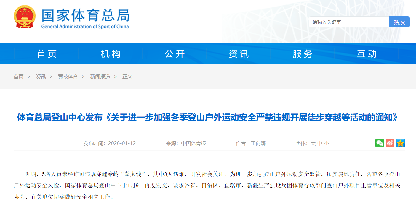 国家体育总局登山中心发布《关于进一步加强冬季登山户外运动安全严禁违规开展徒步穿越等活动的通知》