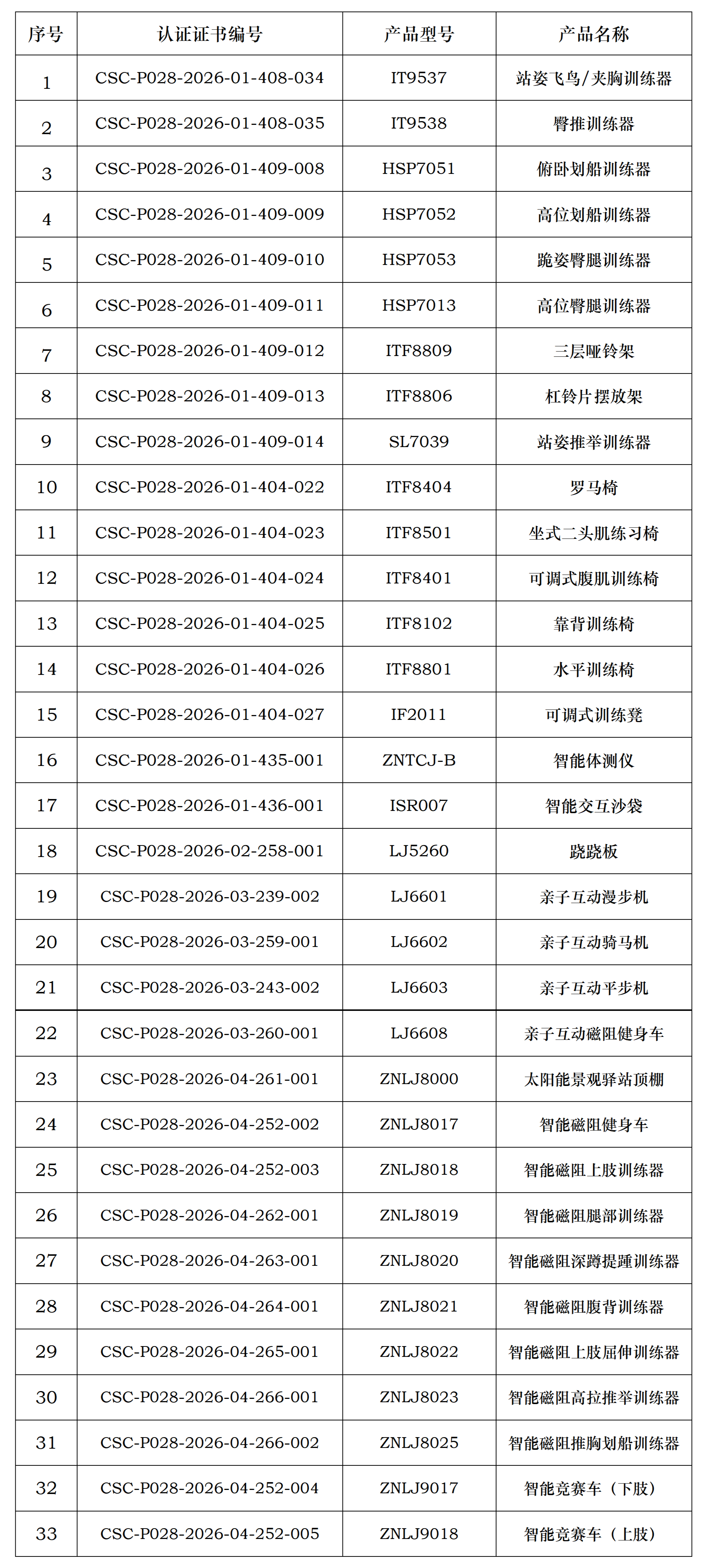 青岛英派斯健康科技股份有限公司获得由中体联(北京)认证服务有限公司颁发的产品认证证书,证书明细如下(共33张):