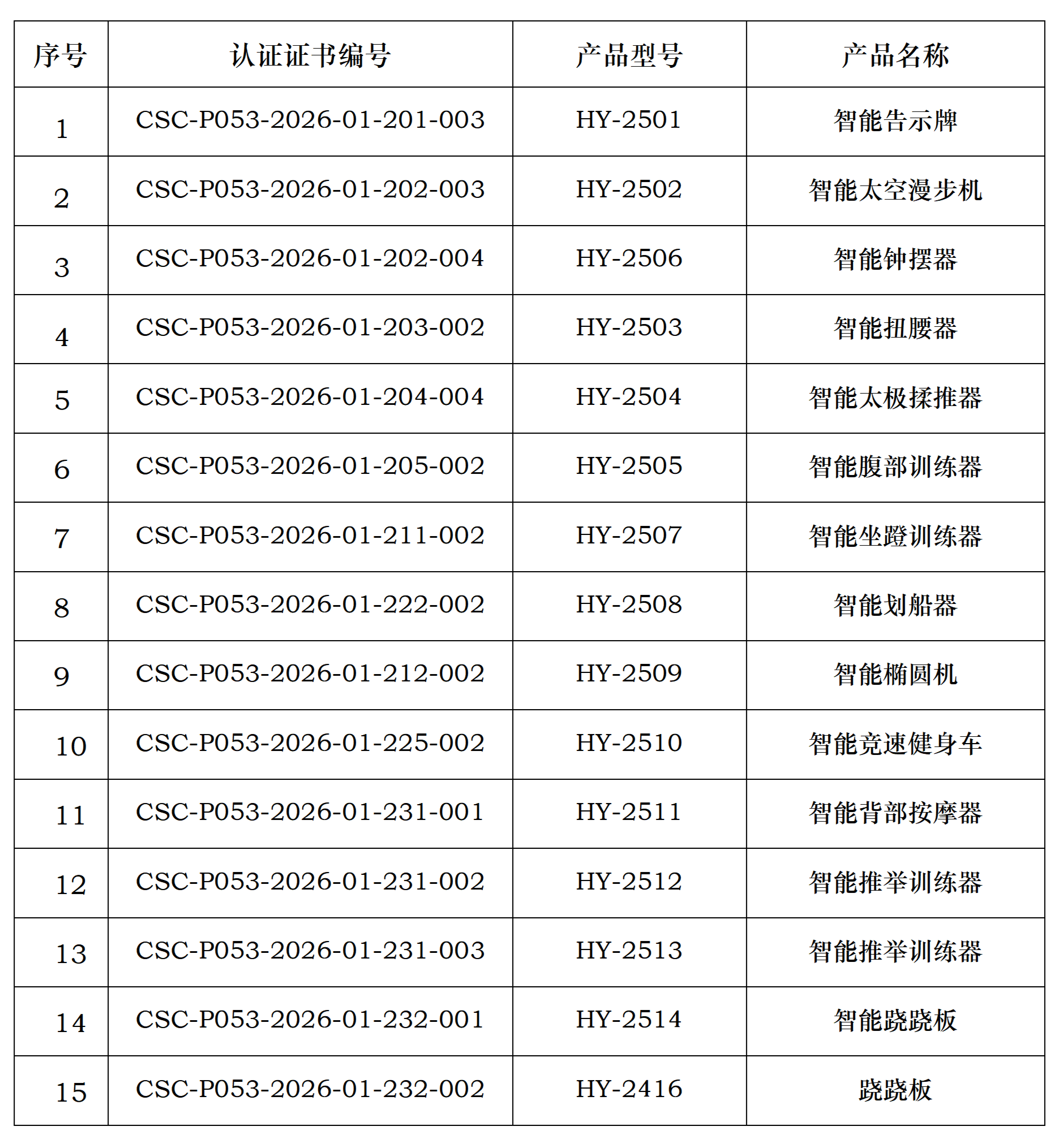 泰州市鸿运体育器材有限公司获得由中体联(北京)认证服务有限公司颁发的产品认证证书,证书明细如下(共15张):