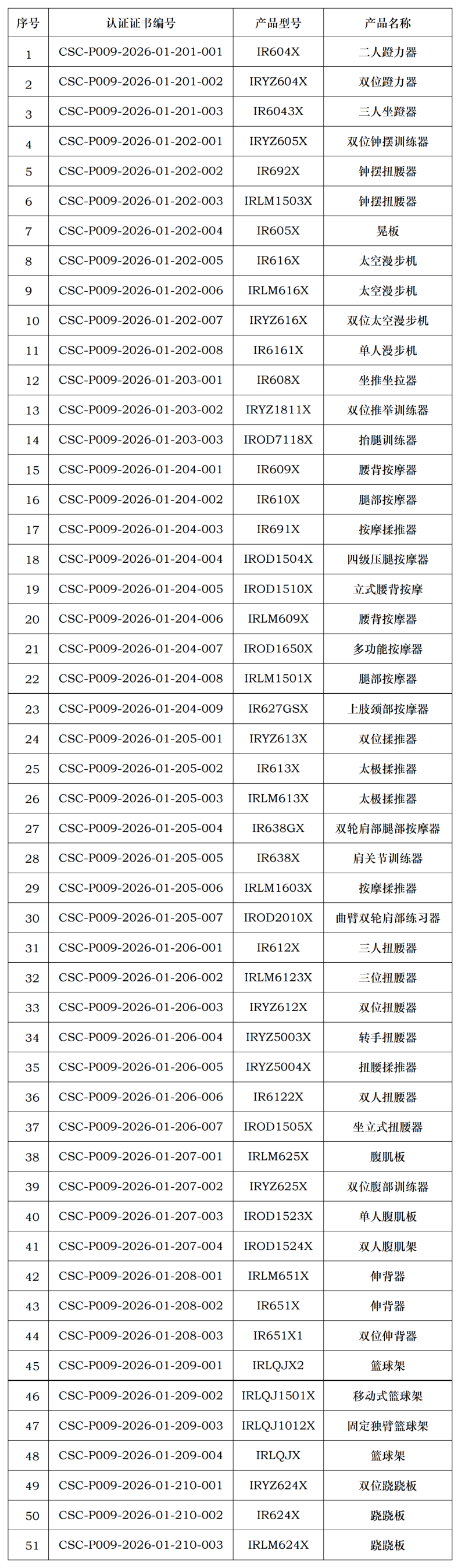 南通铁人运动用品有限公司获得由中体联(北京)认证服务有限公司颁发的产品认证证书,证书明细如下(共51张):