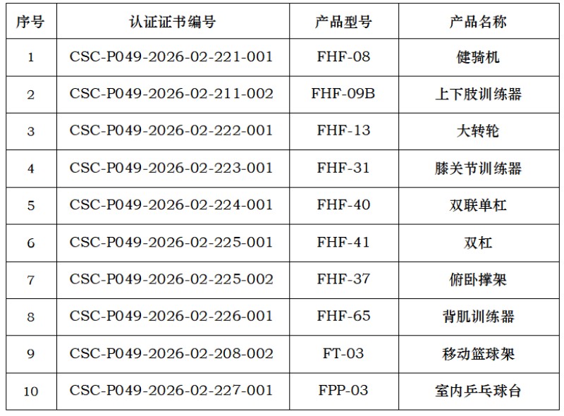山东飞尔康体育设施有限公司获得由中体联(北京)认证服务有限公司颁发的产品认证证书,证书明细如下(共10张):
