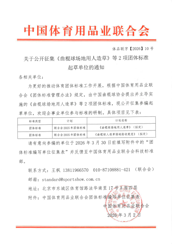 为更好的推动体育团体标准工作开展,根据中国体育用品业联合会《团体标准管理办法》规定,由中国曲棍球协会提出并主导实施的《曲棍球场地用人造草》等2项团体标准,现公开征集参编起草单位,欢迎企事业单位参与标准的研制。具体项目见下表: