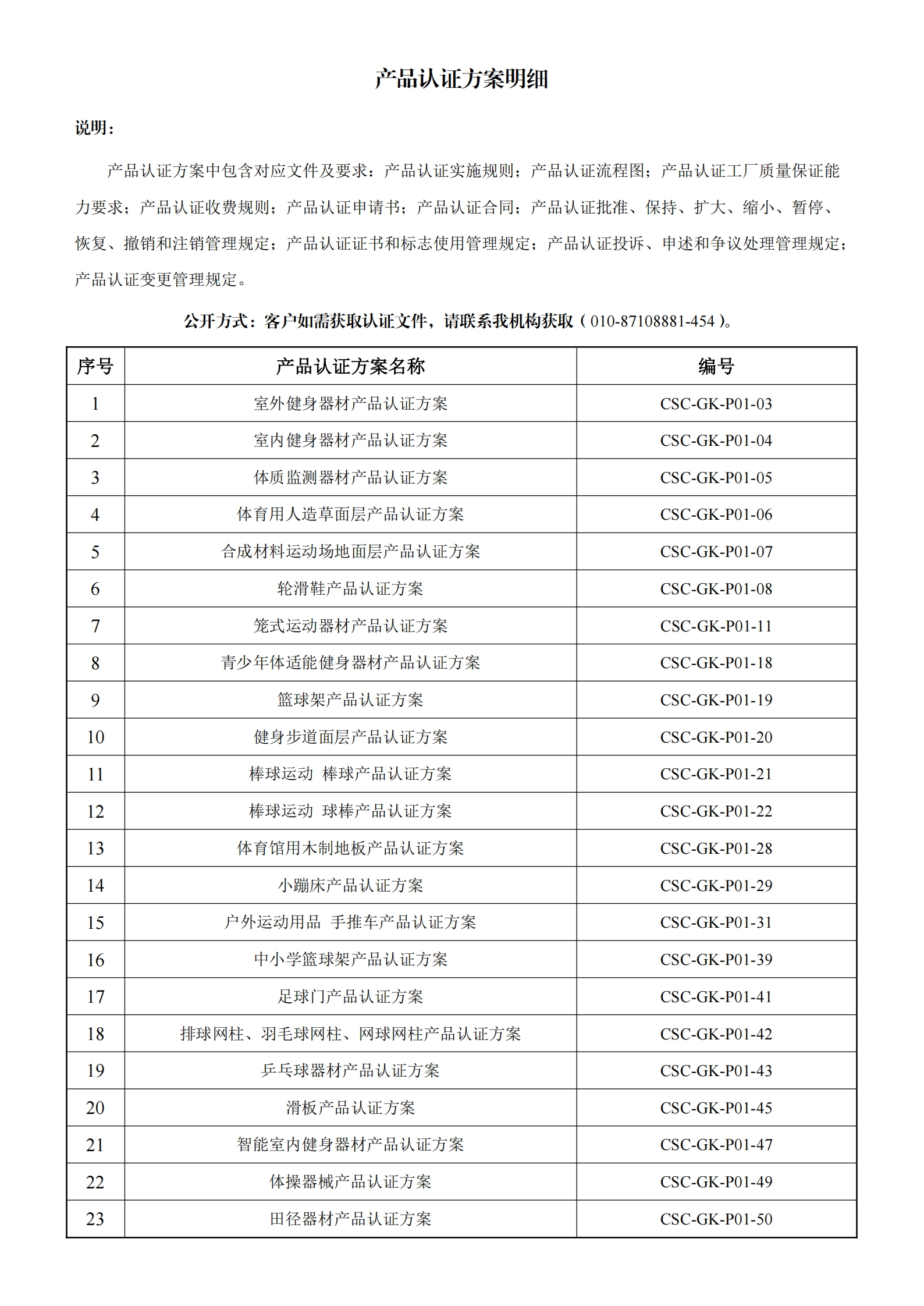 自愿性产品认证,认证范围:滑雪产品;球门、球架产品;冰鞋产品;乒乓球产品;轮滑产品;羽毛球产品;水上运动产品;网球产品;室内健身器材产品;高尔夫球产品;门球产品;室外健身器材产品;棒球、垒球产品;健身小器械产品;按摩器材产品;发球器产品;体操器材产品;运动手套产品;钓鱼产品;田径器械产品;举重器械产品;登山运动器材产品;武术器械产品;休闲设备产品;射箭产品;军事体育器材产品;击剑产品;场馆设施辅助器材产品;训练器材产品;体育用人造草产品;拳击台产品;运动面层产品;游泳池产品;体质监测产品;球类产品;老年人健身器材产品等。