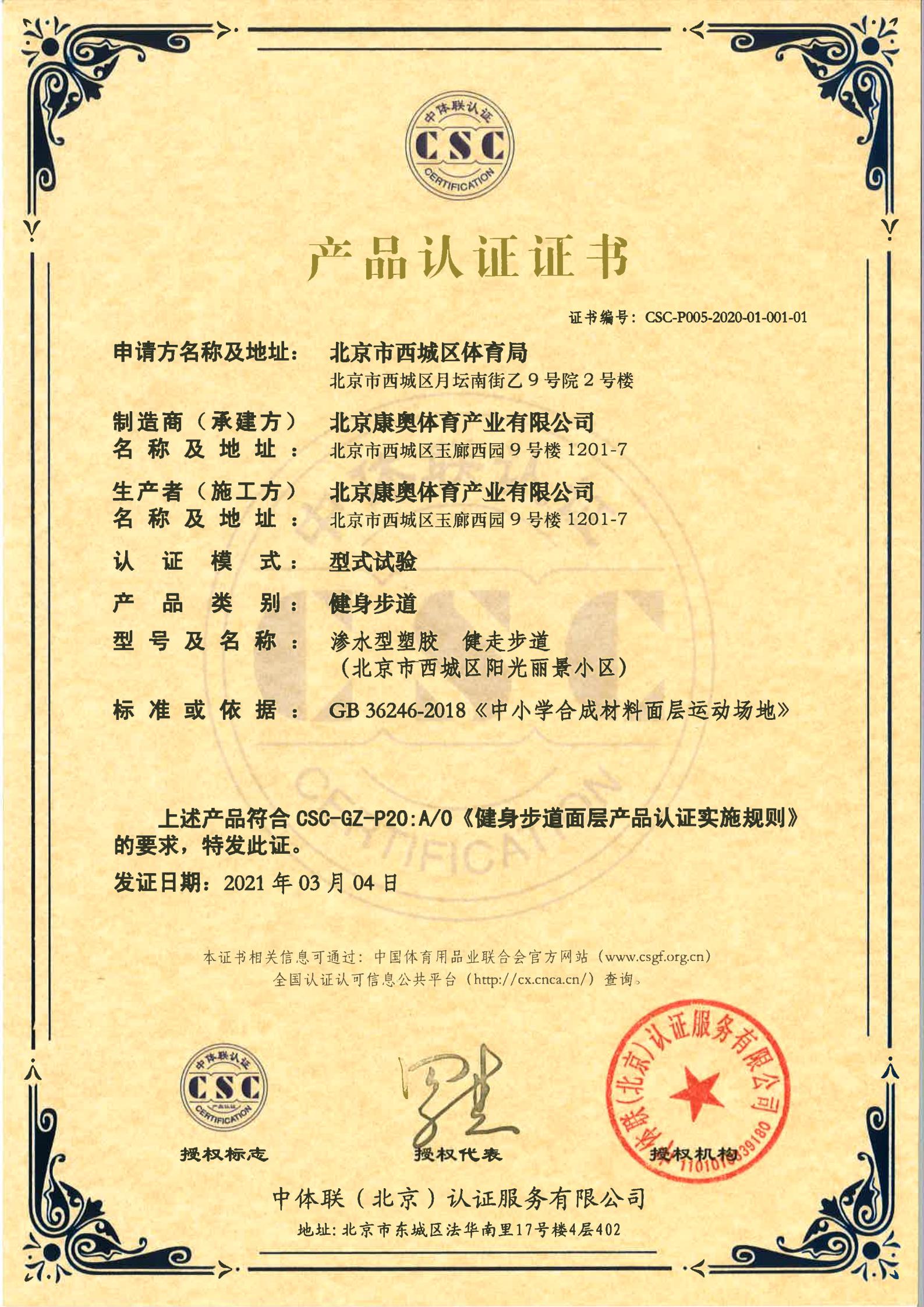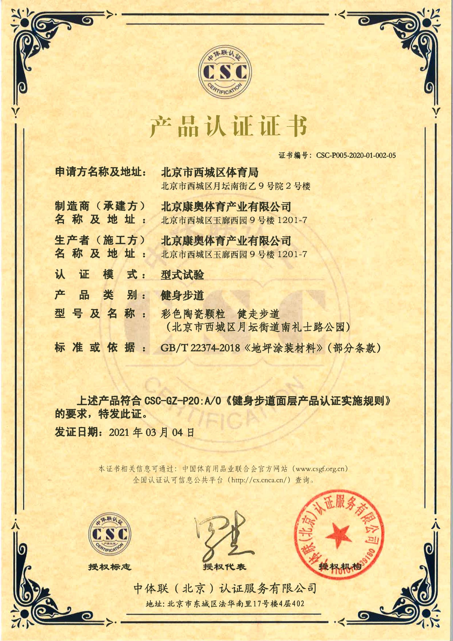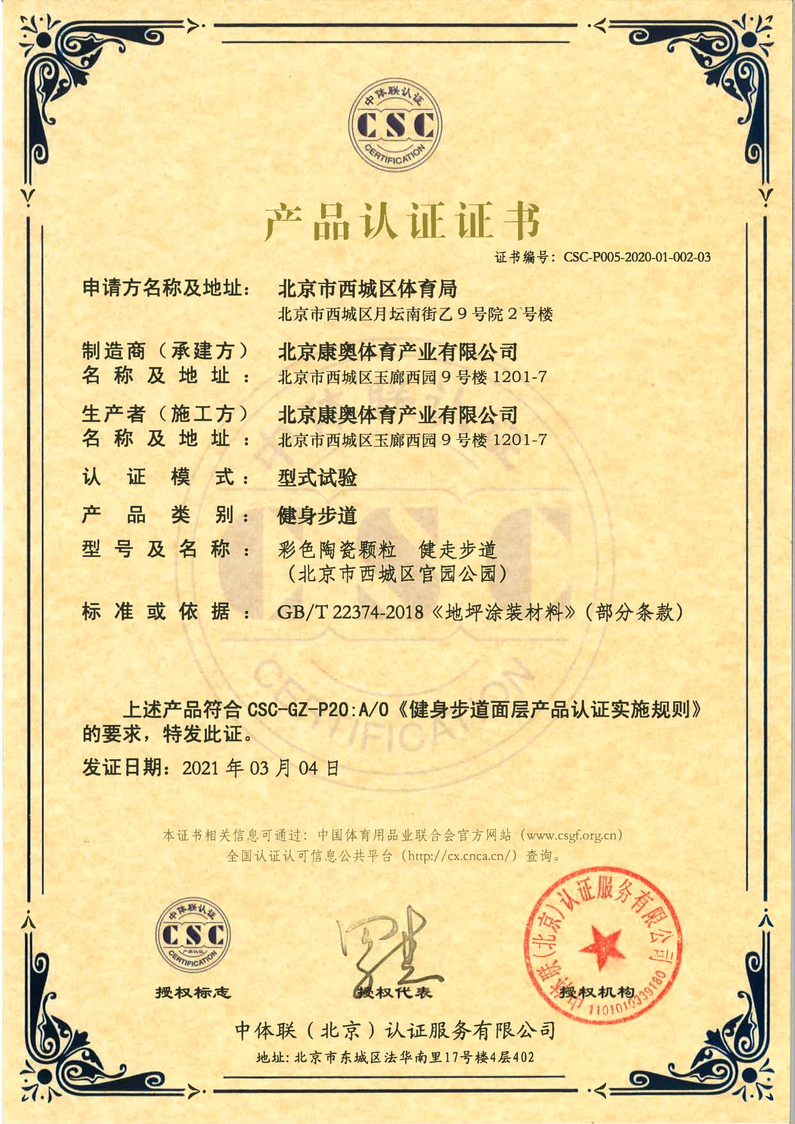 | 健身步道面层 | CSC-P005-2020-01-002-01 | 彩色陶瓷颗粒 健走步道 | 2021-3-4 | 有效 | 点击 |
