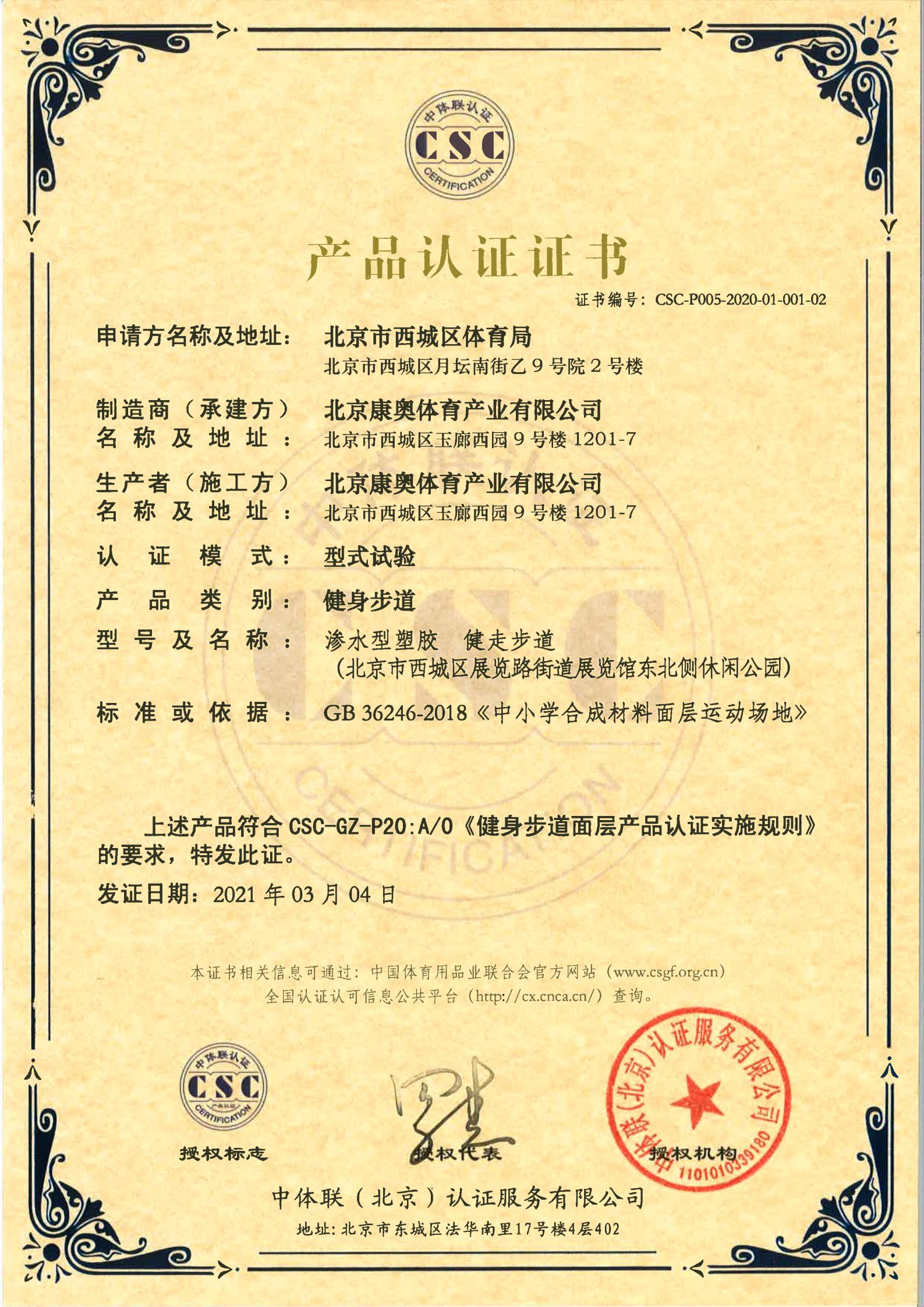 | 健身步道面层 | CSC-P005-2020-01-001-02 | 渗水型塑胶 健走步道 | 2021-3-4 | 有效 | 点击 |