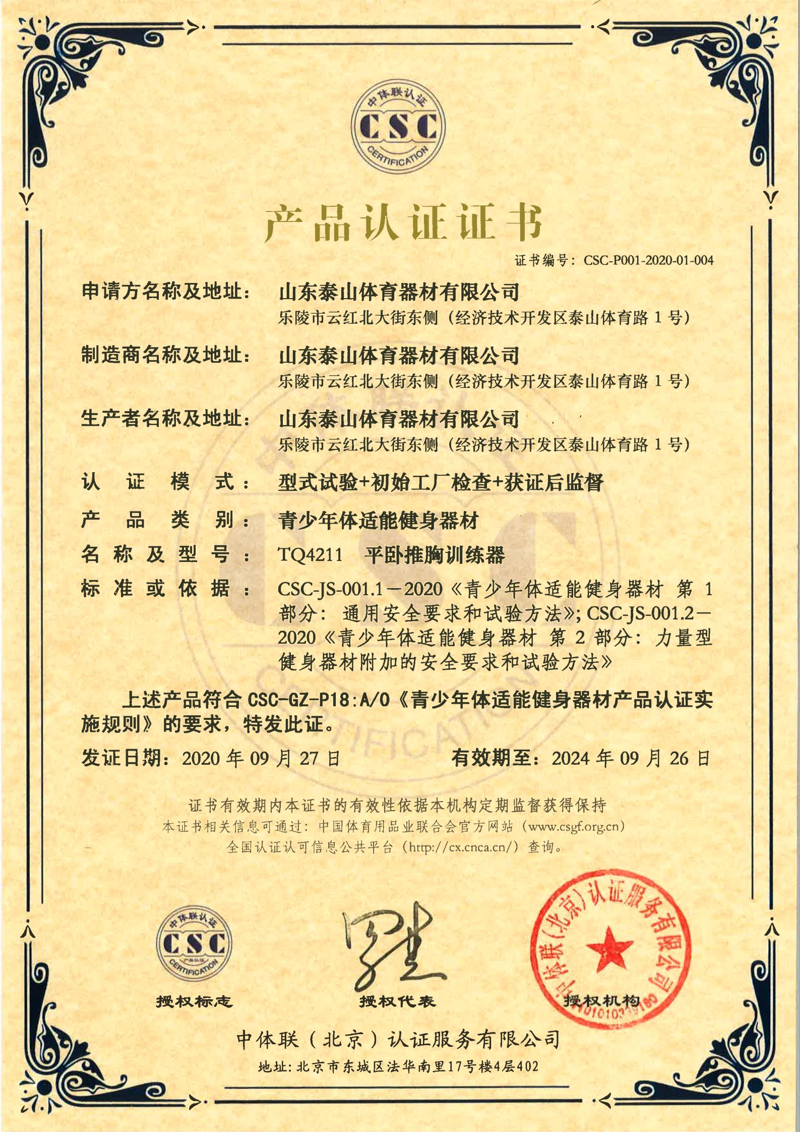 | 青少年体适能健身器材 | CSC-P001-2020-01-004 | TQ4211 | 平卧推胸训练器 | 2020-09-27 | 有效 | 点击 |