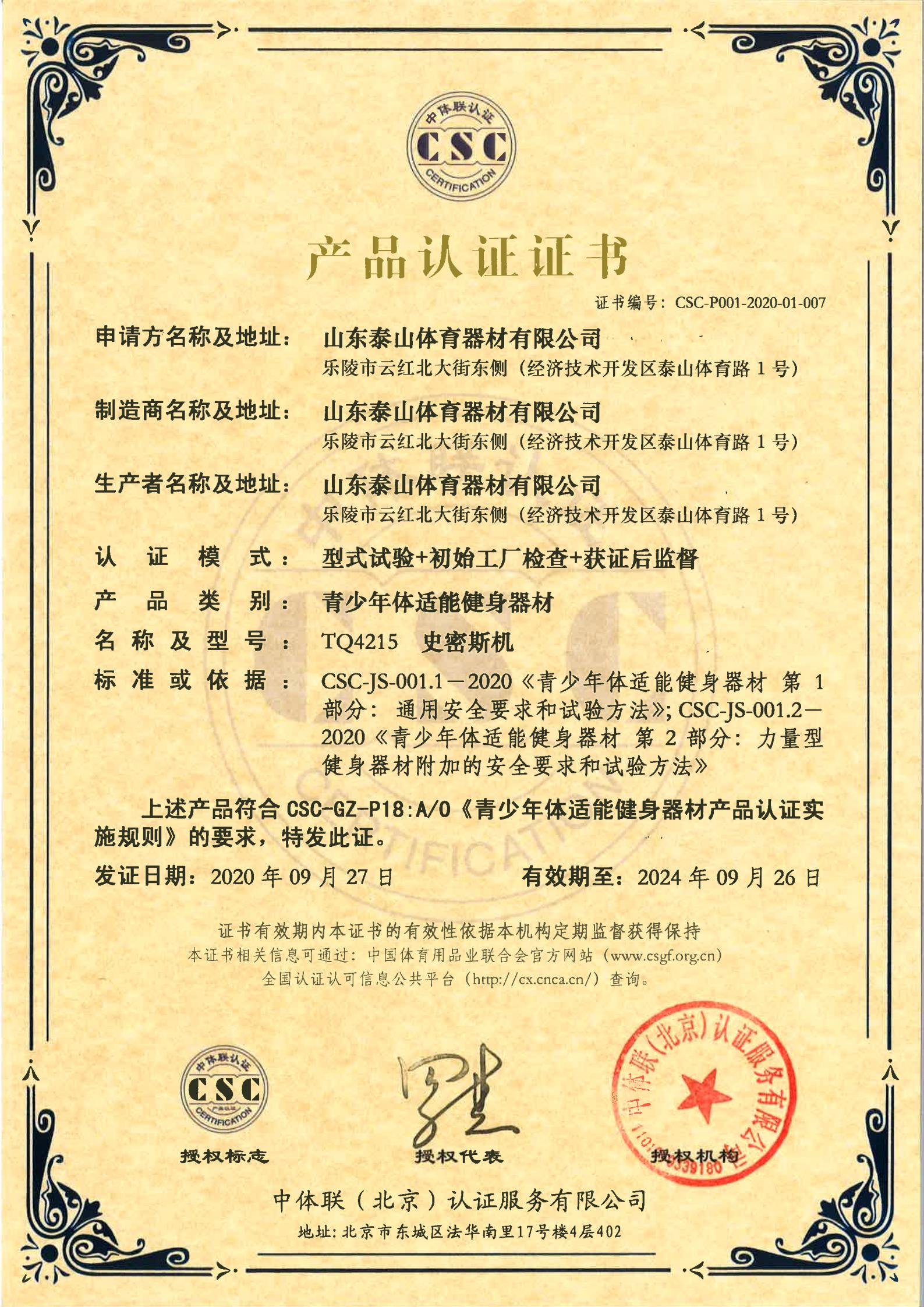 | 青少年体适能健身器材 | CSC-P001-2020-01-007 | TQ4215 | 史密斯机 | 2020-09-27 | 有效 | 点击 |