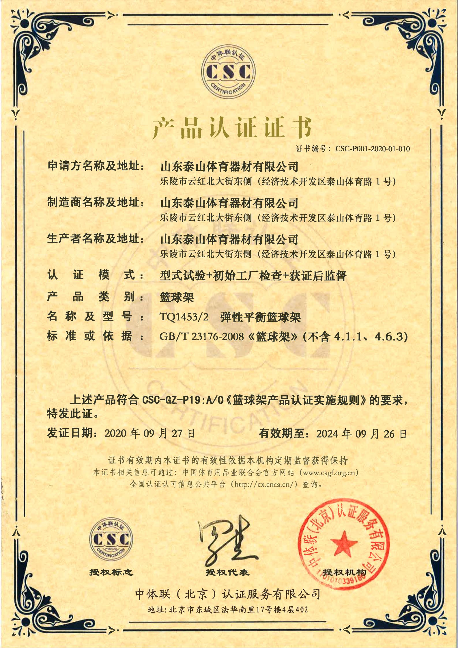 | 获证组织名称:山东泰山体育器材有限公司 | ||||||