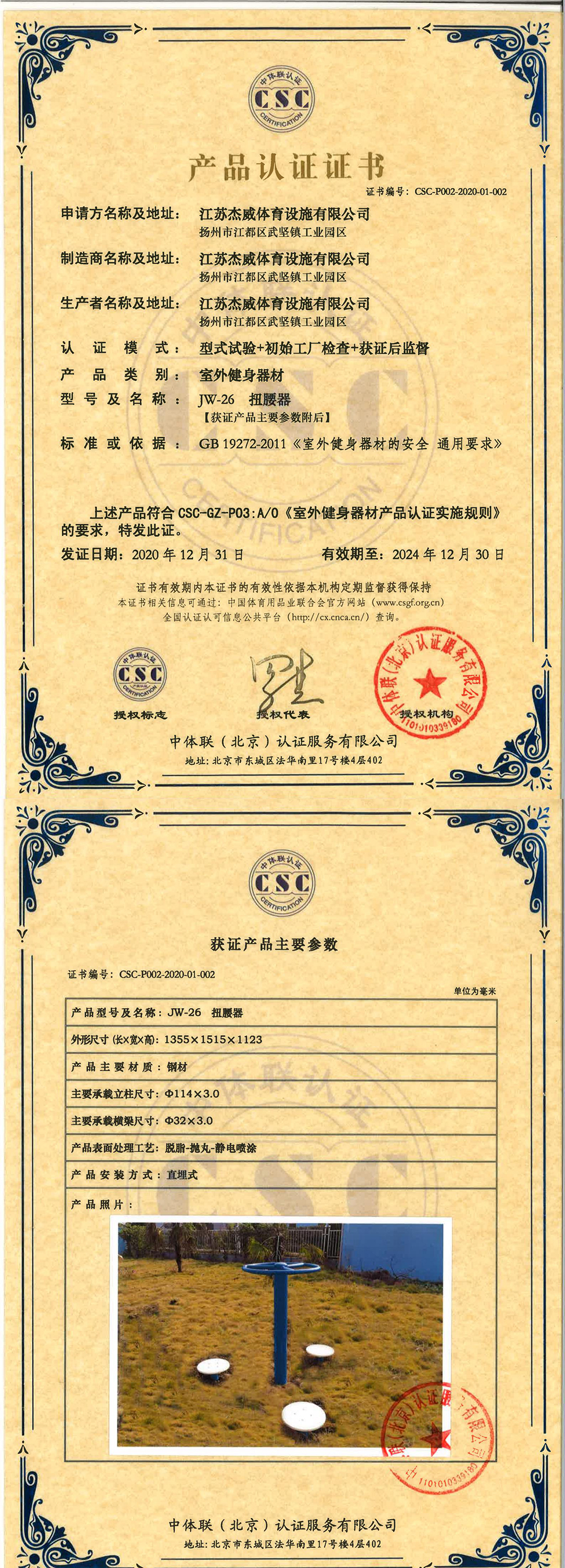 | 室外健身器材 | CSC-P002-2020-01-002 | JW-26 | 扭腰器 | 2020-12-31 | 有效 | 点击 |