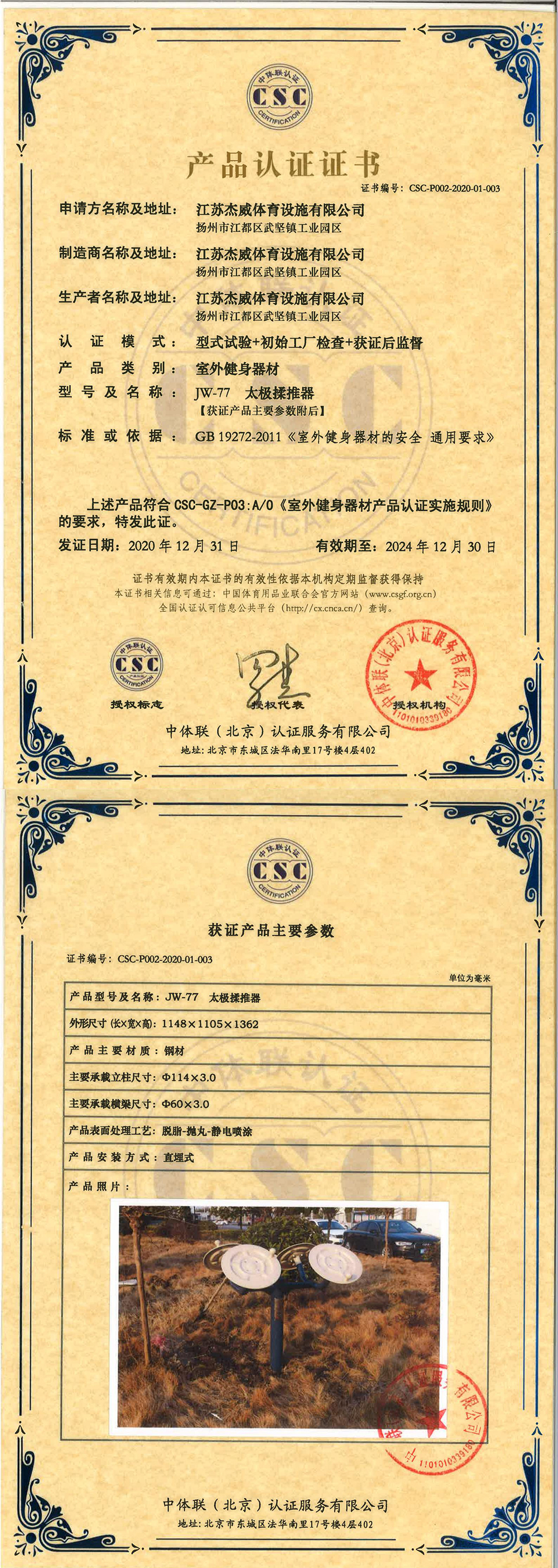 | 室外健身器材 | CSC-P002-2020-01-003 | JW-77 | 太极揉推器 | 2020-12-31 | 有效 | 点击 |