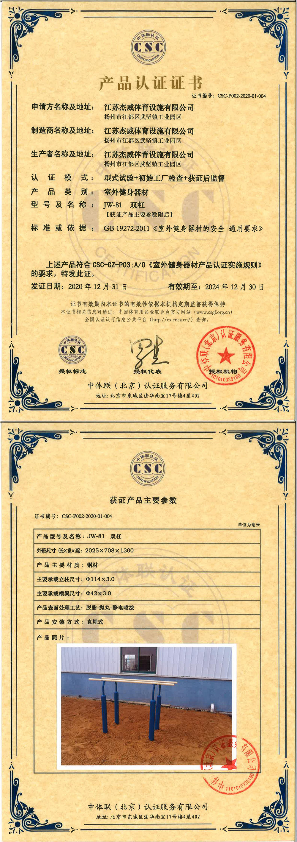 | 室外健身器材 | CSC-P002-2020-01-004 | JW-81 | 双杠 | 2020-12-31 | 有效 | 点击 |