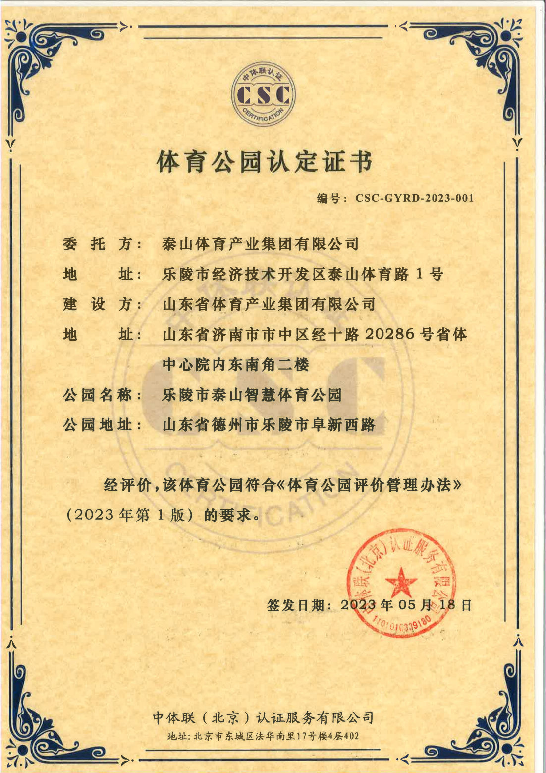 泰山体育产业集团有限公司 证书详情(点击)