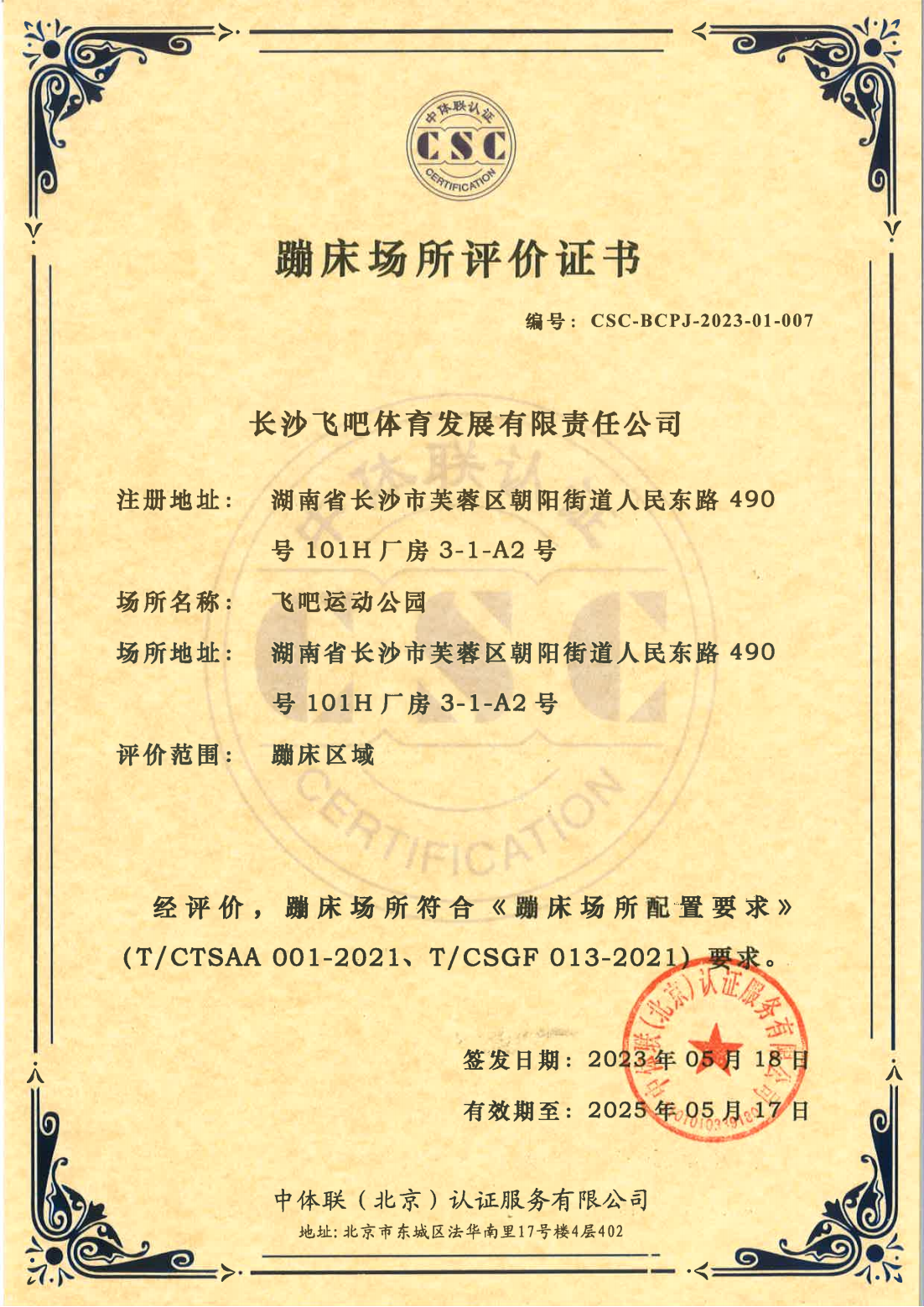 长沙飞吧体育发展有限责任公司 证书详情(点击)