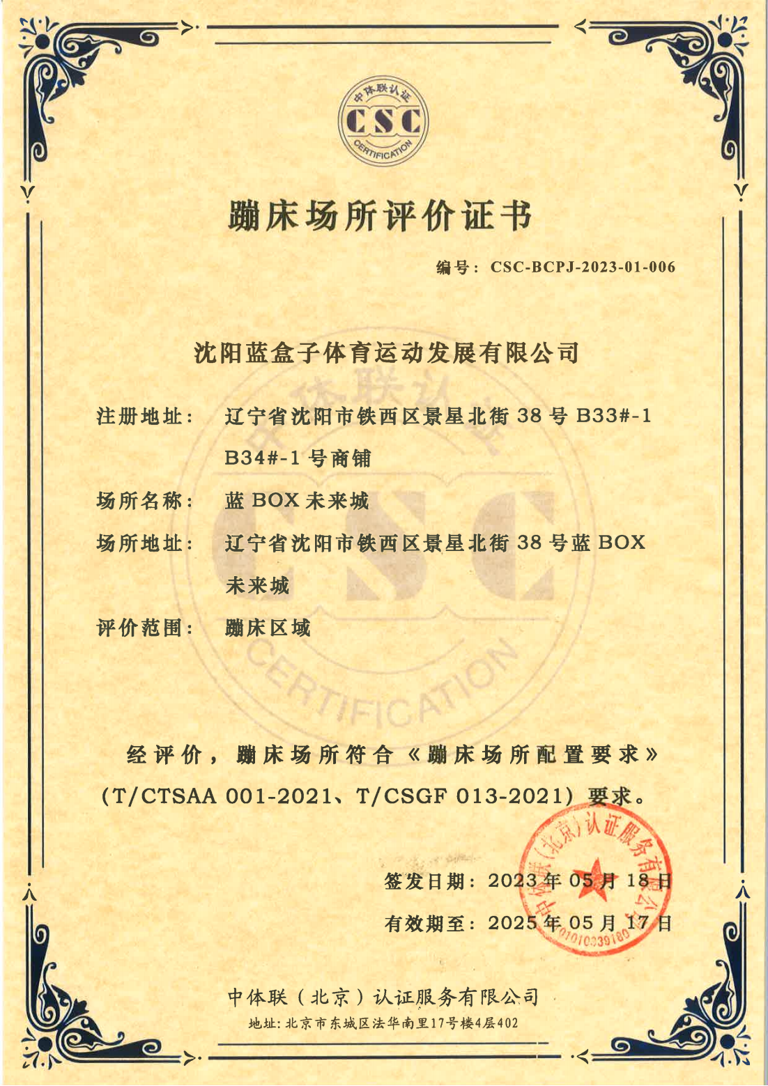 沈阳蓝盒子体育运动发展有限公司 证书详情(点击)